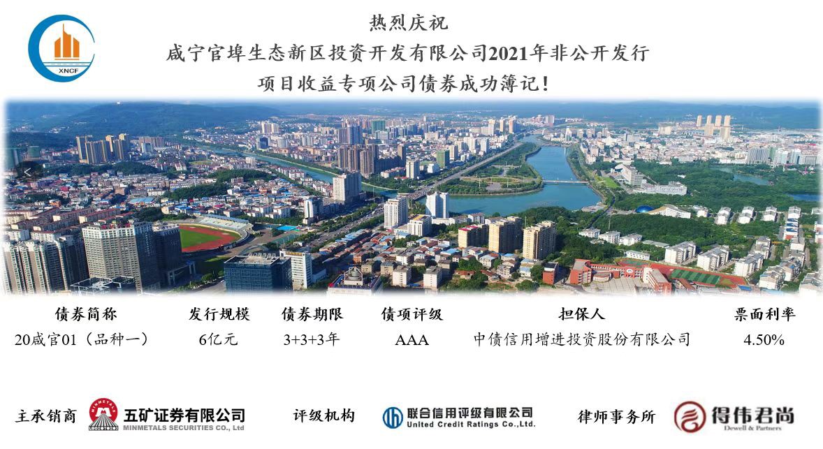 ??????? 2021年3月11日,由中債信用增進(jìn)投資股份有限公司(以下簡(jiǎn)稱“中債信用增進(jìn)公司”)提供增信服務(wù)的“咸寧官埠生態(tài)新區(qū)投資開(kāi)發(fā)有限公司2021年非公開(kāi)發(fā)行項(xiàng)目收益專項(xiàng)公司債券(品種一)”成功發(fā)行,金額6億元,期限為9年(3+3+3),票面利率4.5%。